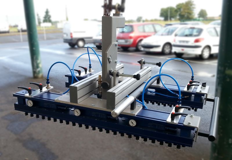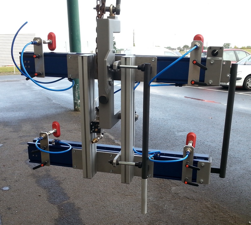 Palonnier avec caisson d'aspiration munie de ventouses à clapets pour prise de portes ou de panneaux.