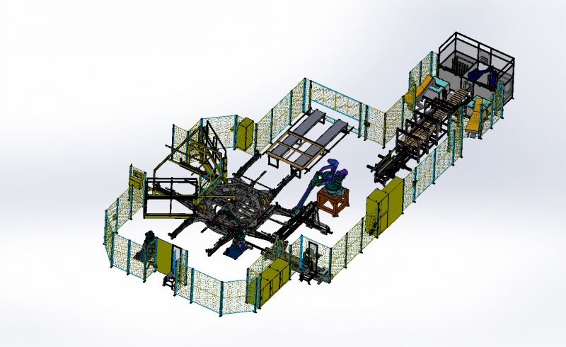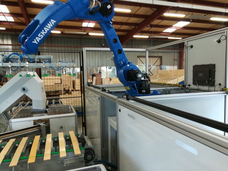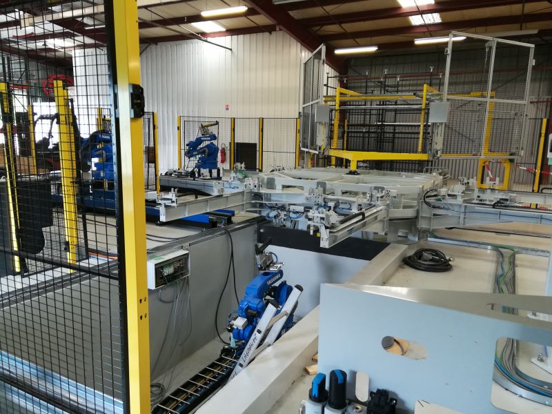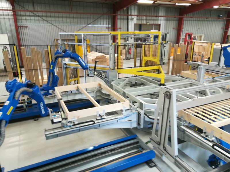 Ligne robotisée permettant l'assemblage des caisses de sommier, la dépose en automatique des embouts de latte, la mise en place et l'agarfage des lattes.