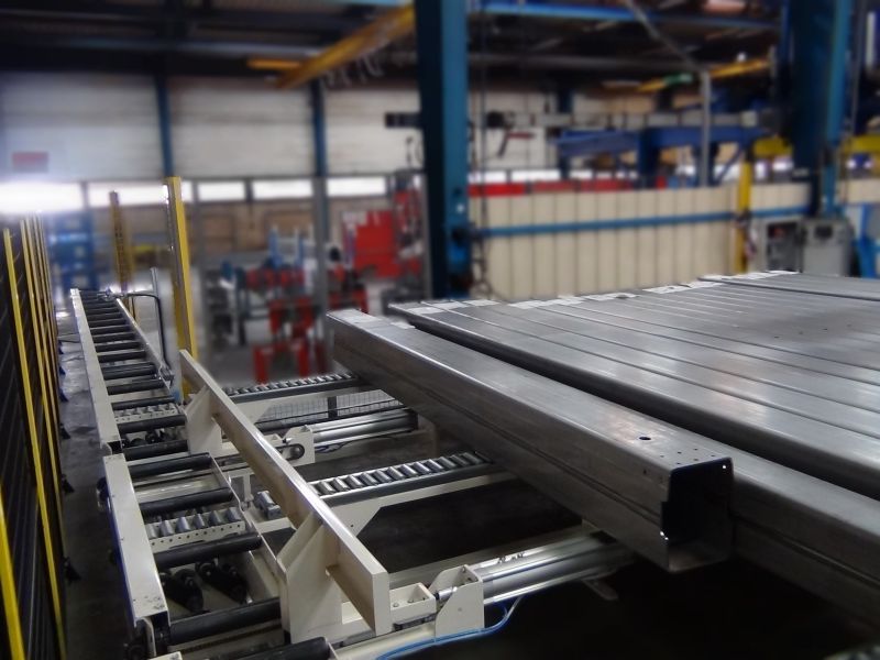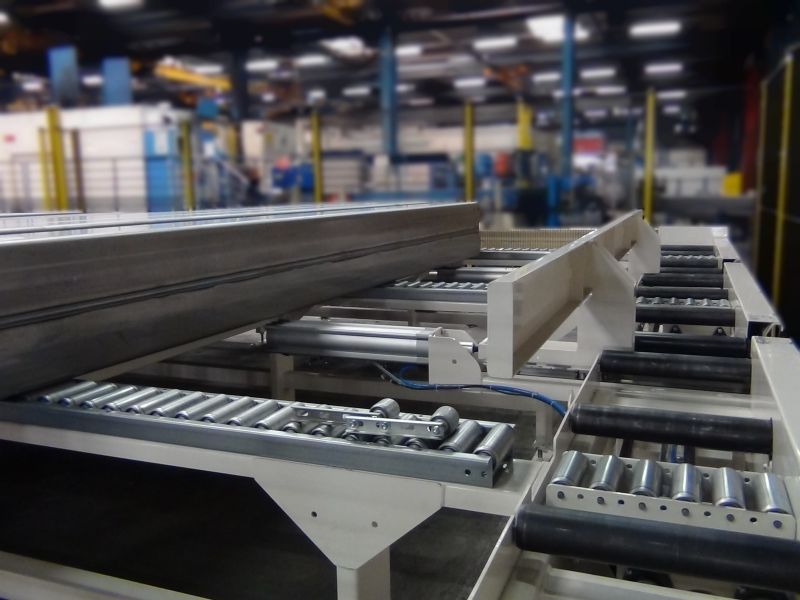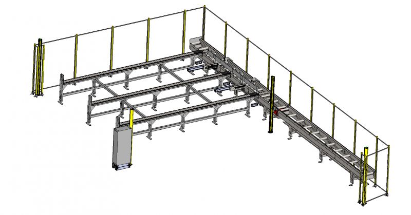 Ligne de convoyage et transfert de tube dans une zone de stockage.