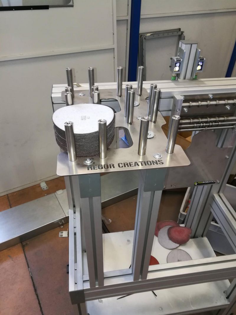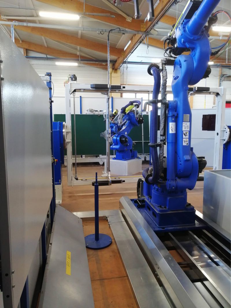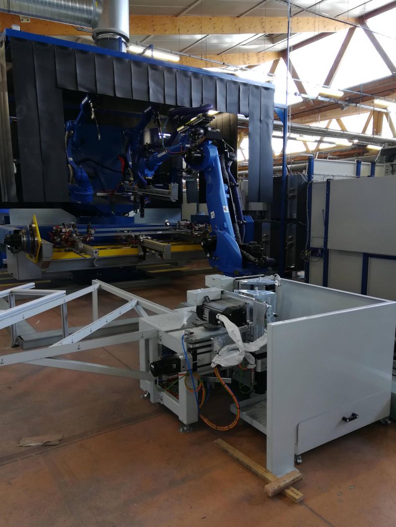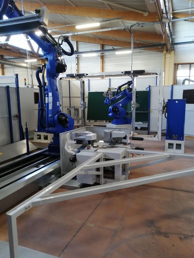 Cellule robotisée pour l'usinage et le meulage de cadres en acier. La cellule est directement intégrée à une ligne robotisée de soudure Yaskawa. Le meulage est effectué à l'aide d'une tête numérique Ferrobotics avec un changement d'abarsifs en automatique.