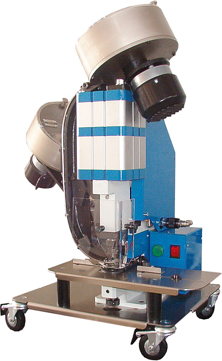 Machine avec doubles distributions pour la pose des oeillets rondelles plastique BEJO - perfore et sertit simultanément - déclenchement par bouton - version sur chariot à roulettes pivotantes à blocage - fonctionnement pneumatique et électrique 220 volts monophasé pour les bols - prévue pour une dimension d'oeillets rondelles - sécurité fixe par carter